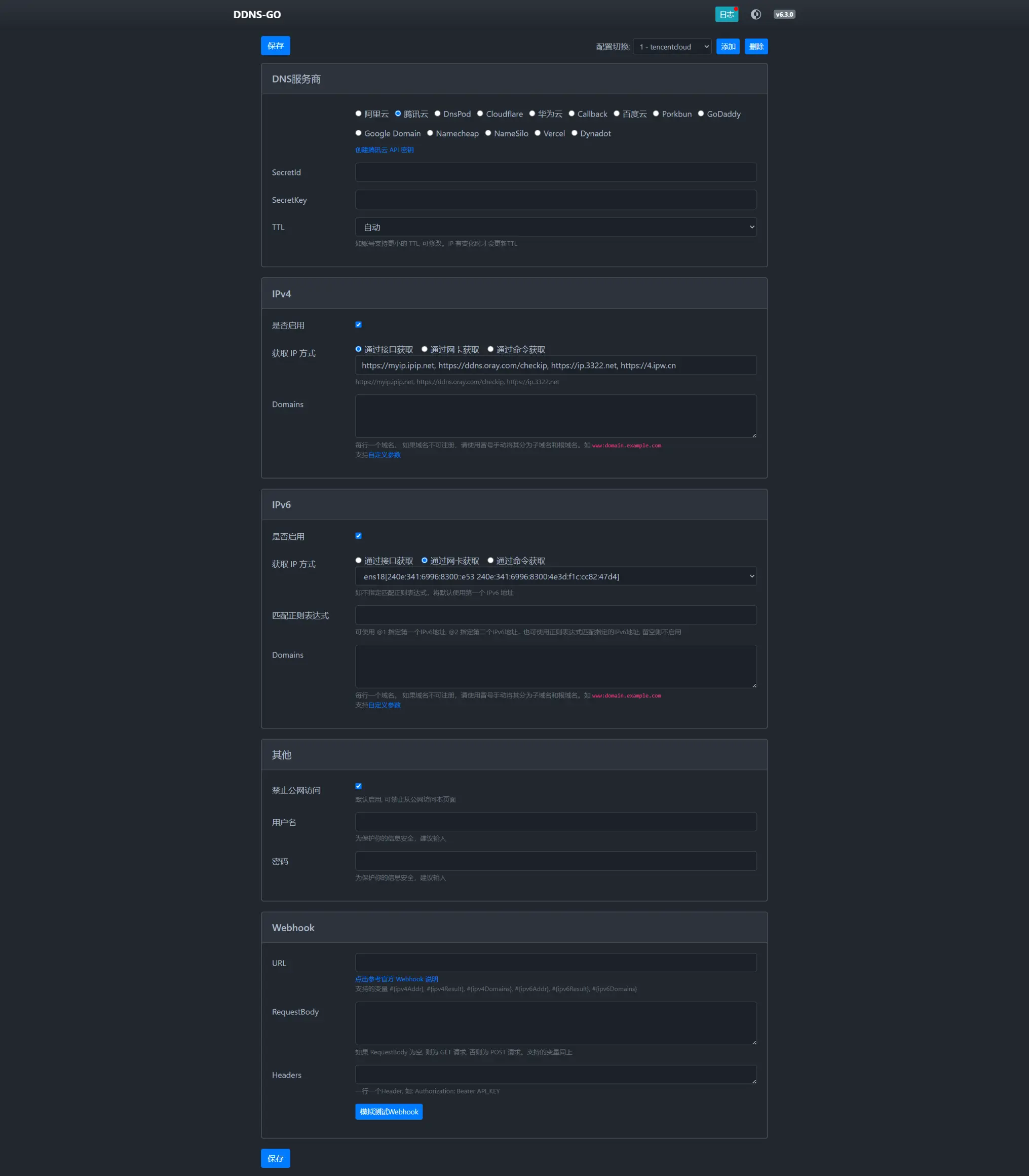 添加完成后保存,然后去域名服务商那查看解析是否添加,确认无误后 ddns-go 就配置完成了,webhook 那个提醒根据文档填就行,没难度跳过了