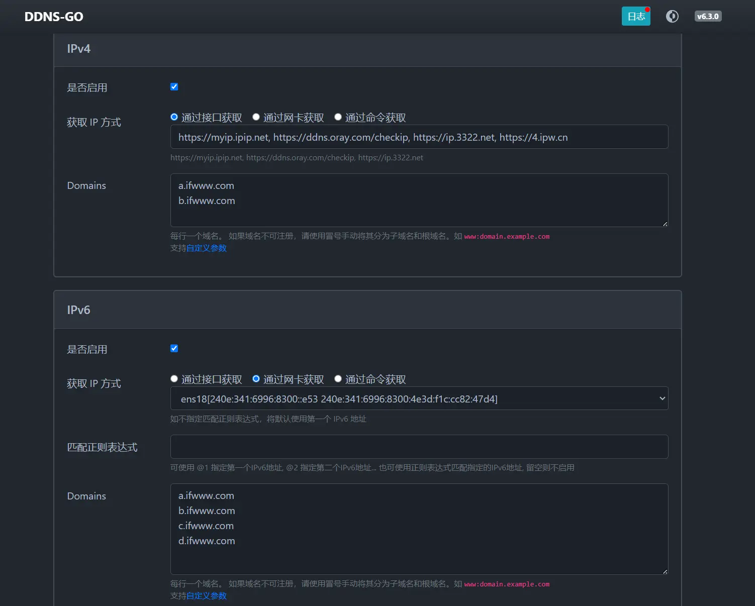 dns 服务商那里就跟着自己域名注册商选择,并且根据输入框上方的蓝字提示填 id 和 key 或者密码,下面 ipv4 和 ipv6 分别添加自己想要绑定的域名