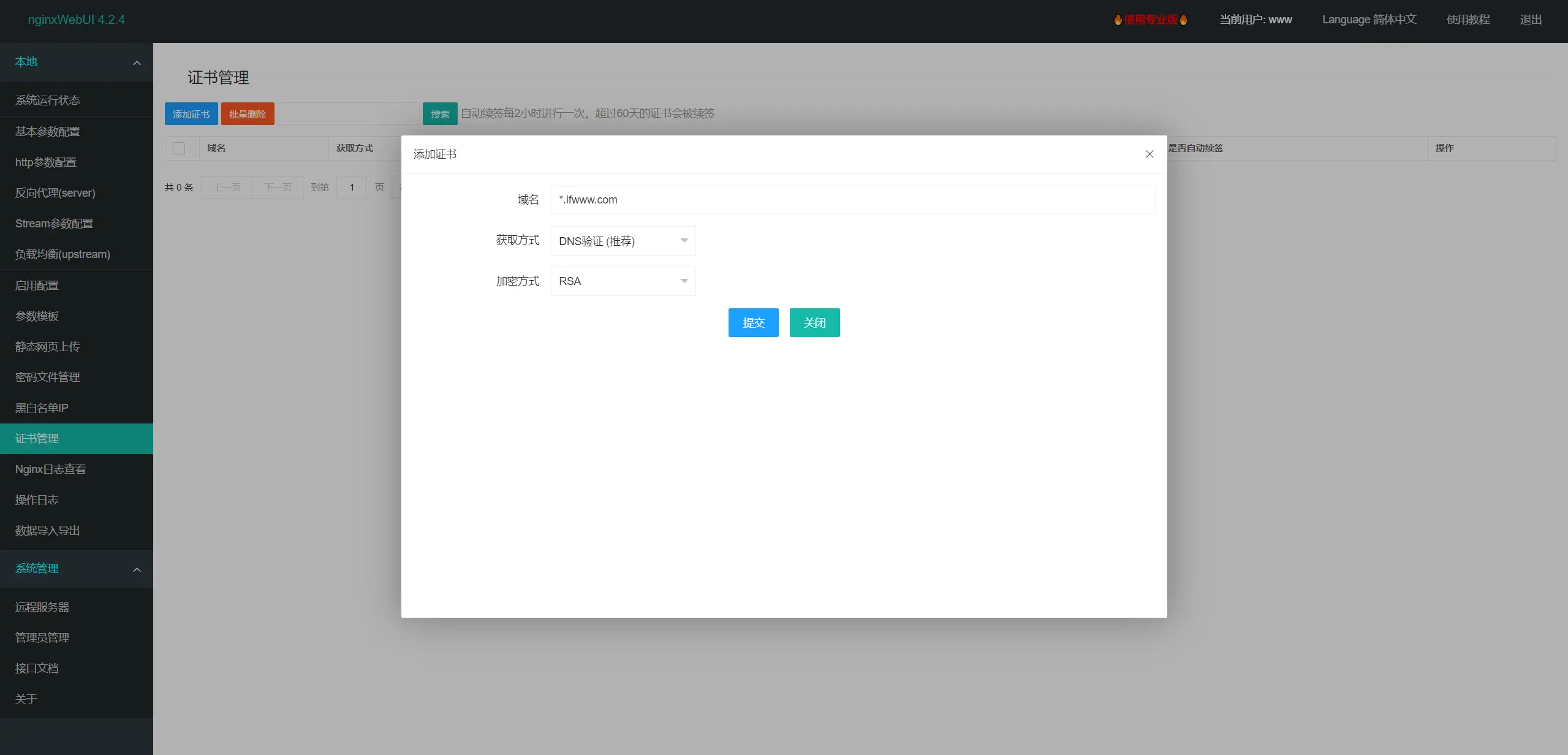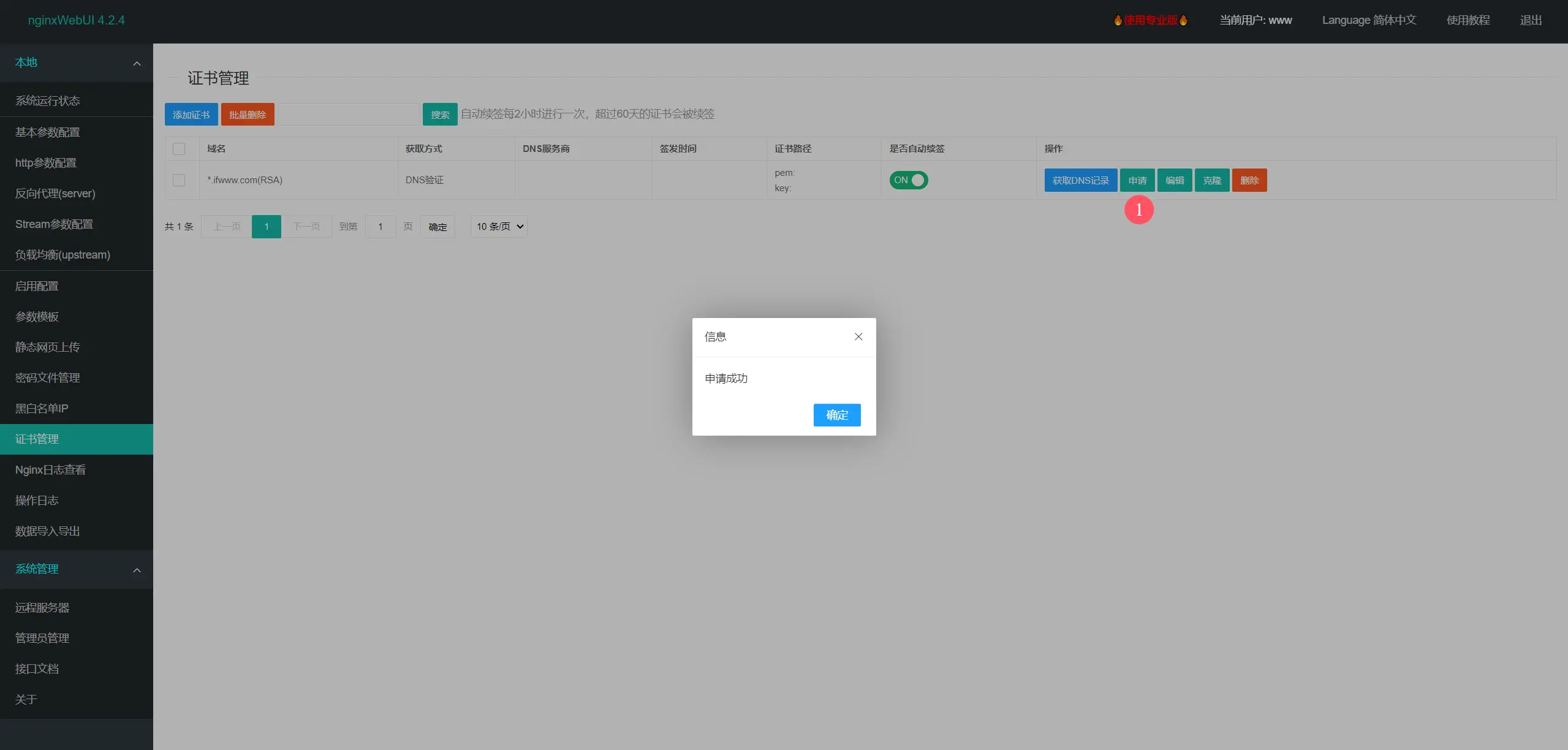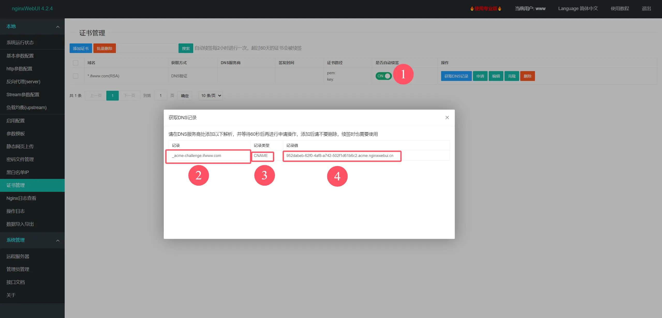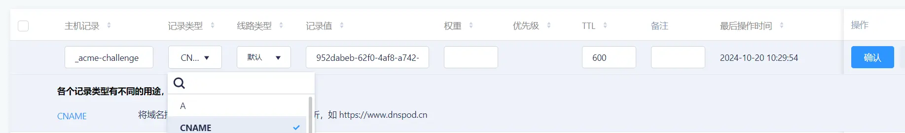 配置 ssl 证书的 dns 验证解析,点击获取dns记录