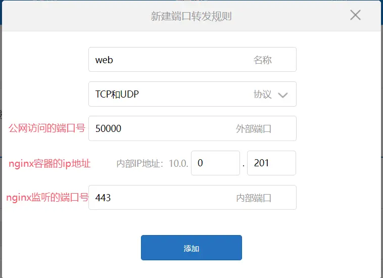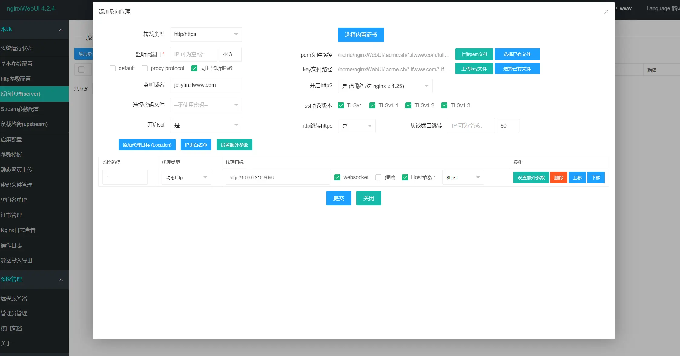这里监听域名和代理目标根据自己的情况填写监听域名:外网访问在地址栏输入的域名代理目标:内网服务的ip地址+端口