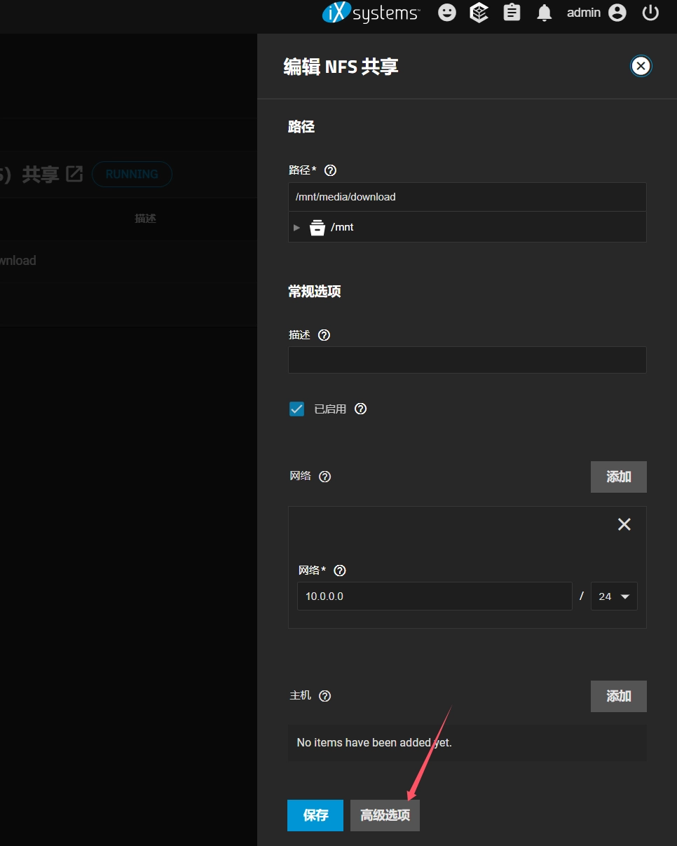 - 打开共享页面,编辑 nfs 共享,选择高级选项