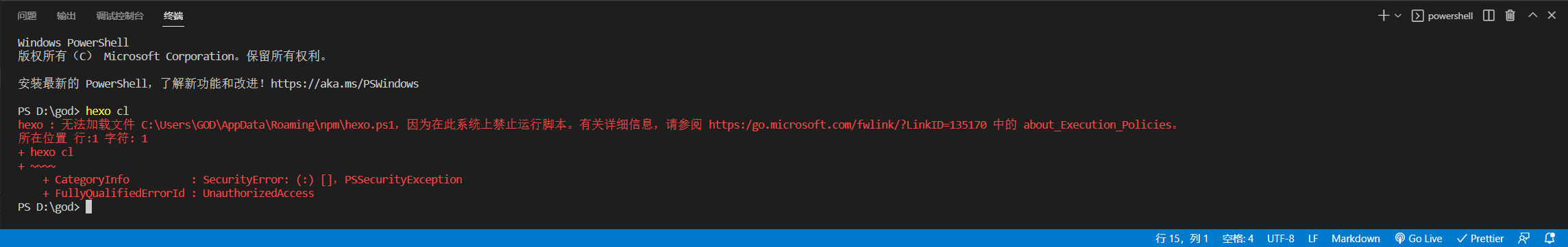 Vscode终端无法执行hexo命令 默认设置下 vscode 终端无法执行 hexo 命令,如下图所示 解决方案如图 Vscode #Notes #Hexo #Vscode Vscode终端无法执行hexo命令 https://ifwww.com/posts/3591.html 作者 鸭梨 发布于 2022年10月23日 许可协议 gitee图床图片失效 上一篇 Butterfly的简单优化 下一篇 Please enable JavaScript to view the comments