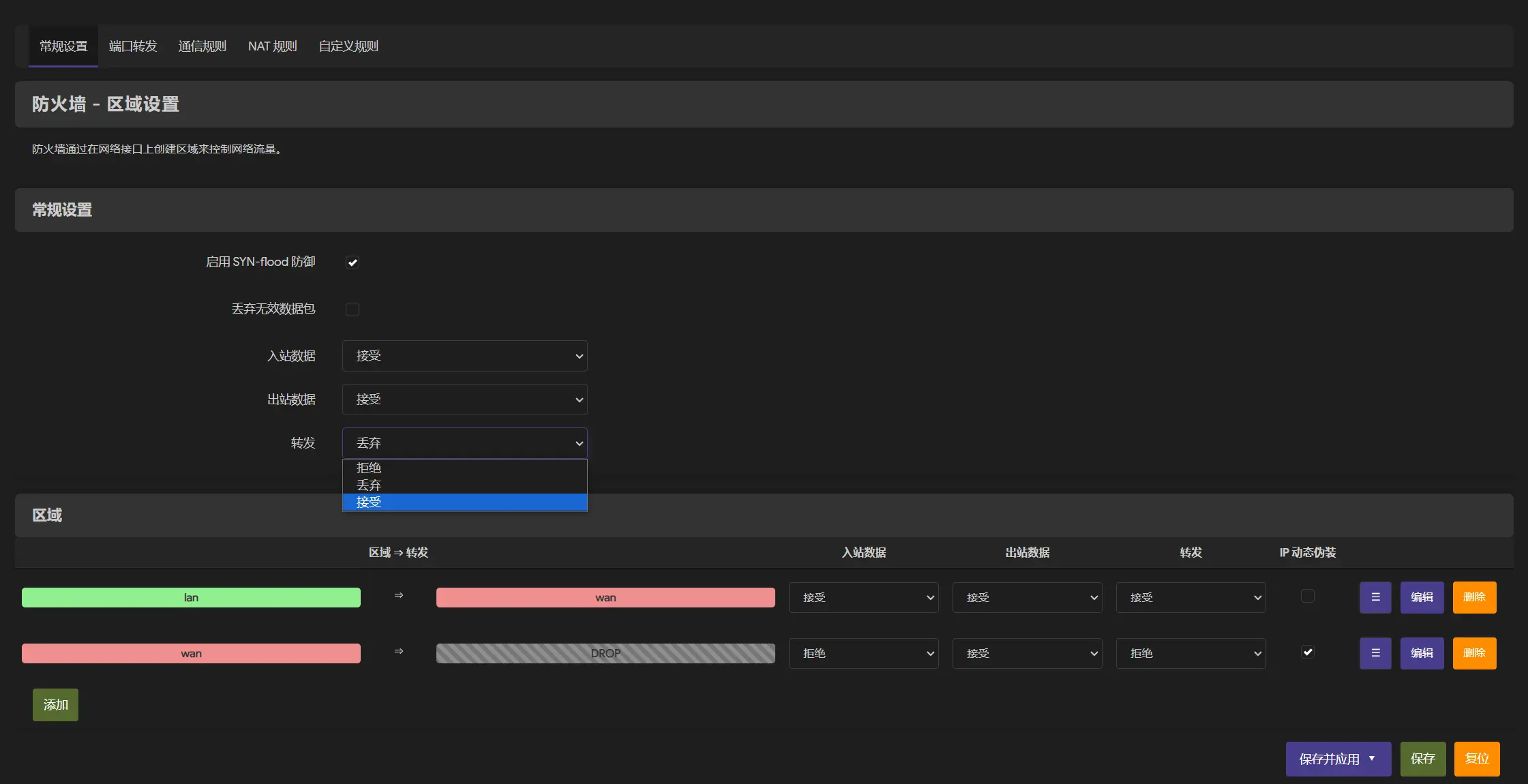 很多教程都是直接让我们在防火墙配置这里,丢弃转发或者拒绝转发改为允许 这种操作和我们硬路由直接关闭防火墙区别不大,严格地说并不太安全 我们可以单独放通 web 端口,而不是直接全部允许转发 打开 ssh 工具,连接路由器, 输入下面命令,打开防火墙配置文件